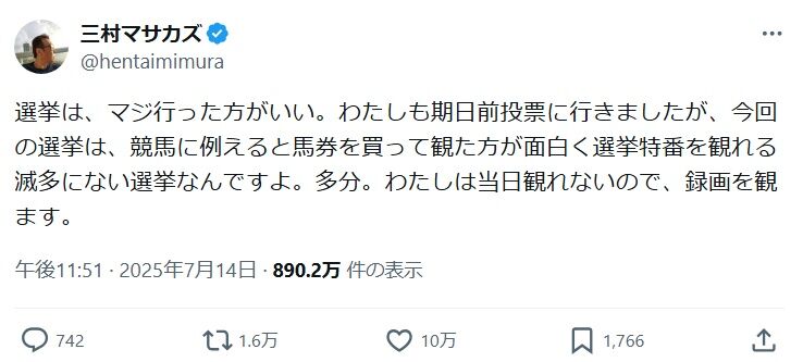 三村マサカズ「選挙は馬券買って競馬を見るようなもの」