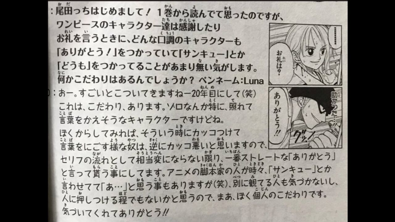 尾田栄一郎「『ありがとう』をカッコつけて他の言葉に言い換えるやつは逆にダサい」
