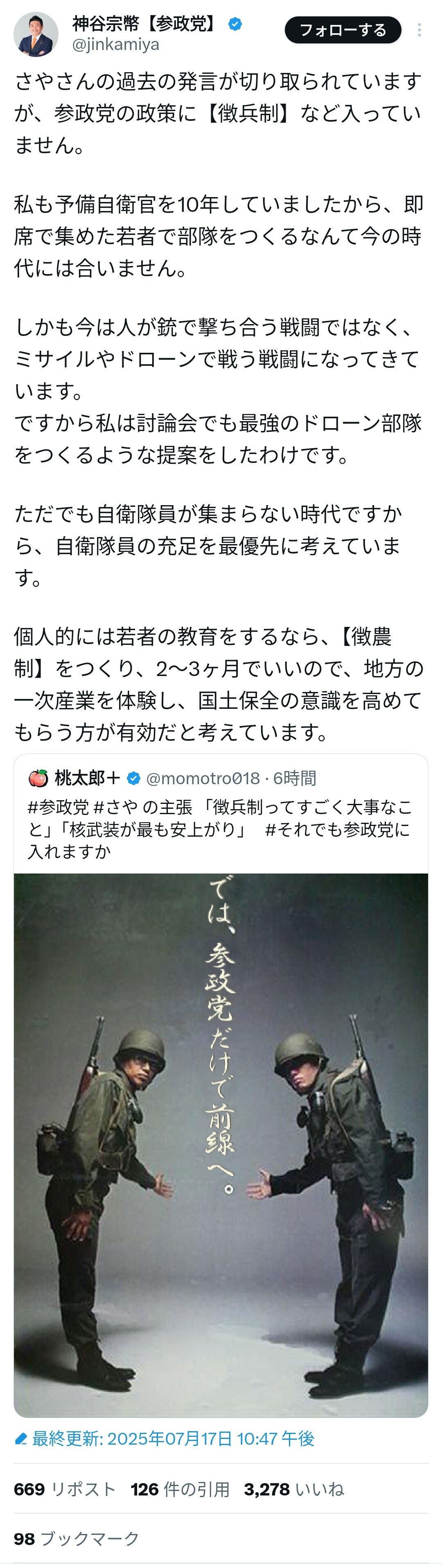 【朗報】参政党・神谷「徴兵制はやらない。やるなら徴農政」