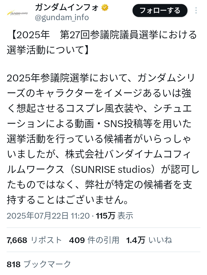 【悲報】山本太郎、バンナムからお叱りを受ける