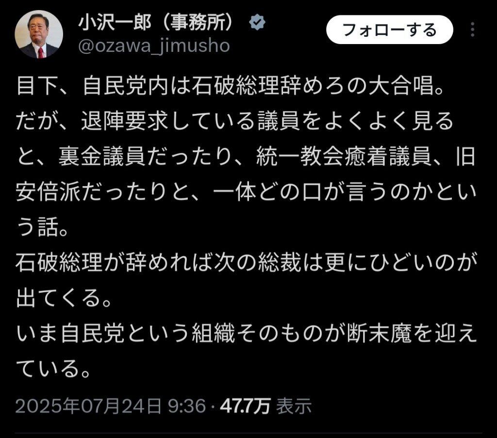 小沢一郎「石破辞めろと言っている議員をよく見てください」