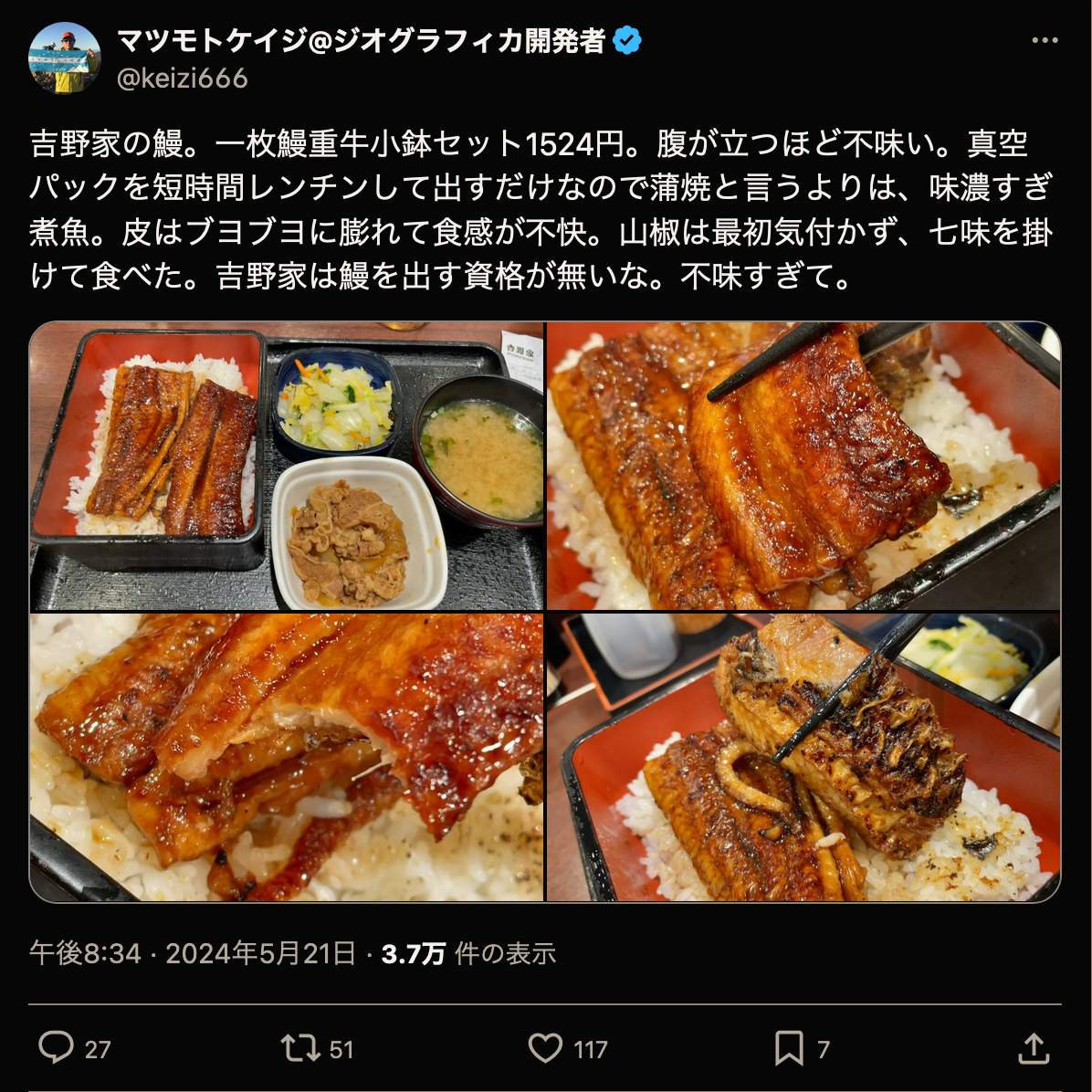 料理研究家さん、吉野家のうなぎを「腹が立つほど不味い」とイキリ散らす