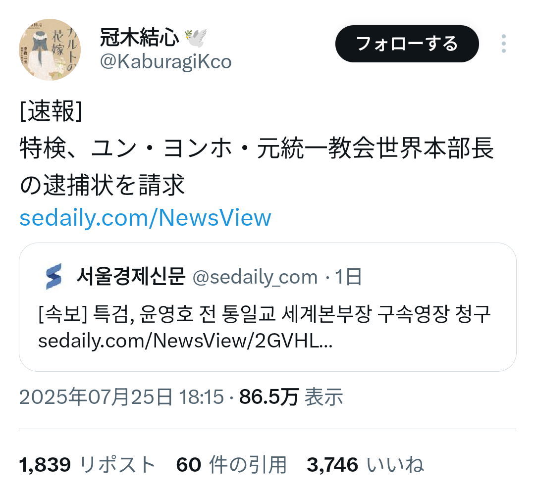 【速報】統一教会ナンバー2、逮捕