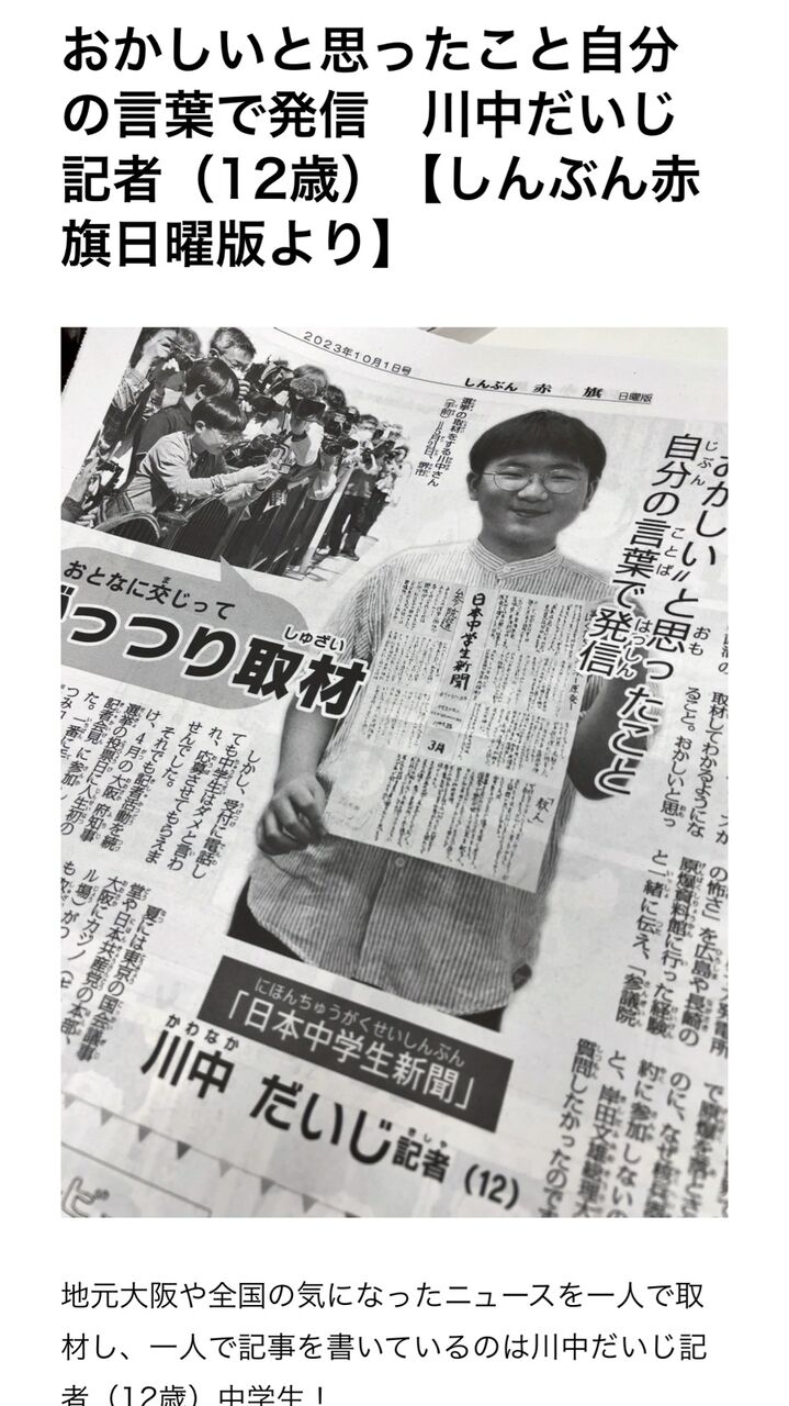 小学3年で政治に興味を持ち、G7広島サミットを取材しようと、2023年(中学1年)で「日本中学生新聞」を立ち上げた。