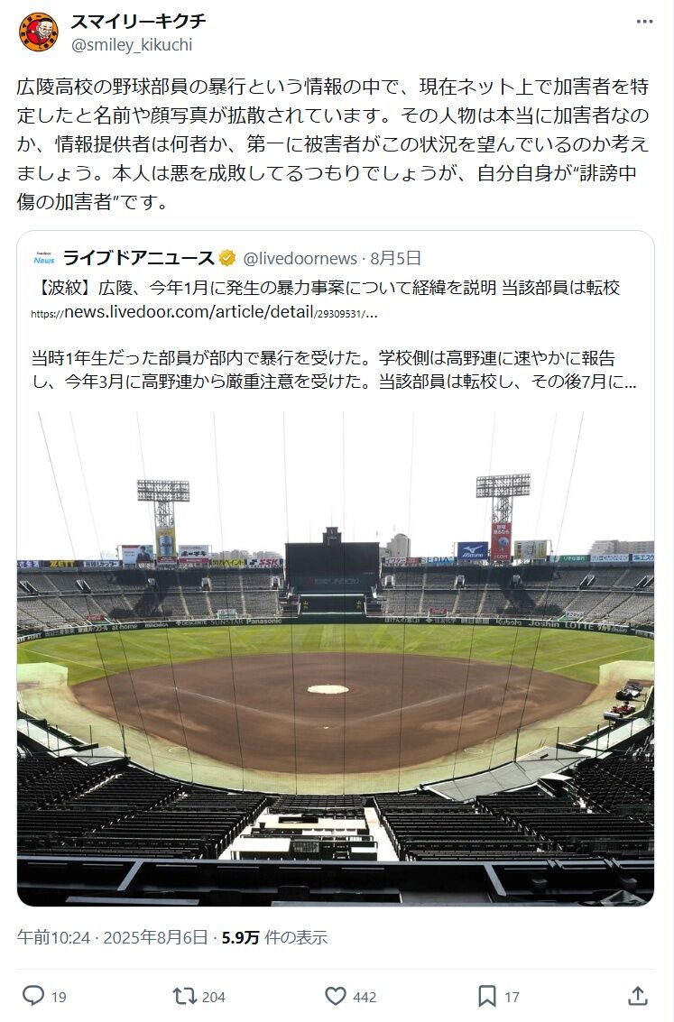 スマイリーキクチ「広陵を叩いてる奴、被害者が叩いてくれと願ってると思ってるのか?」