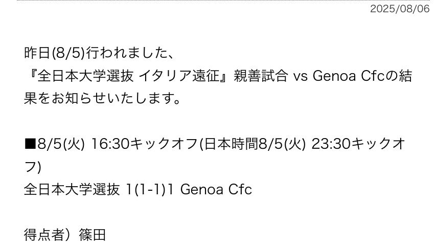 イタリア遠征中の全日本大学選抜がセリエAフィオレンティーナと親善試合を行い、2-1で勝利した。