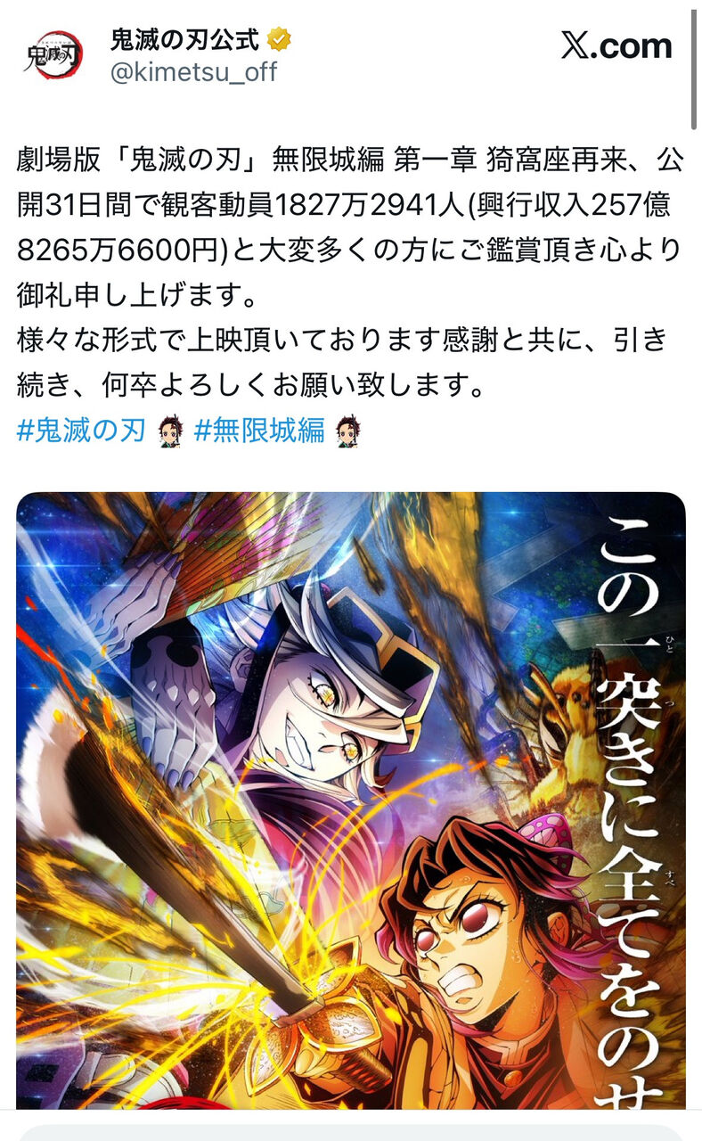 【速報】鬼滅の刃無限城編、公開31日で興行収入257億円突破し日本歴代4位に