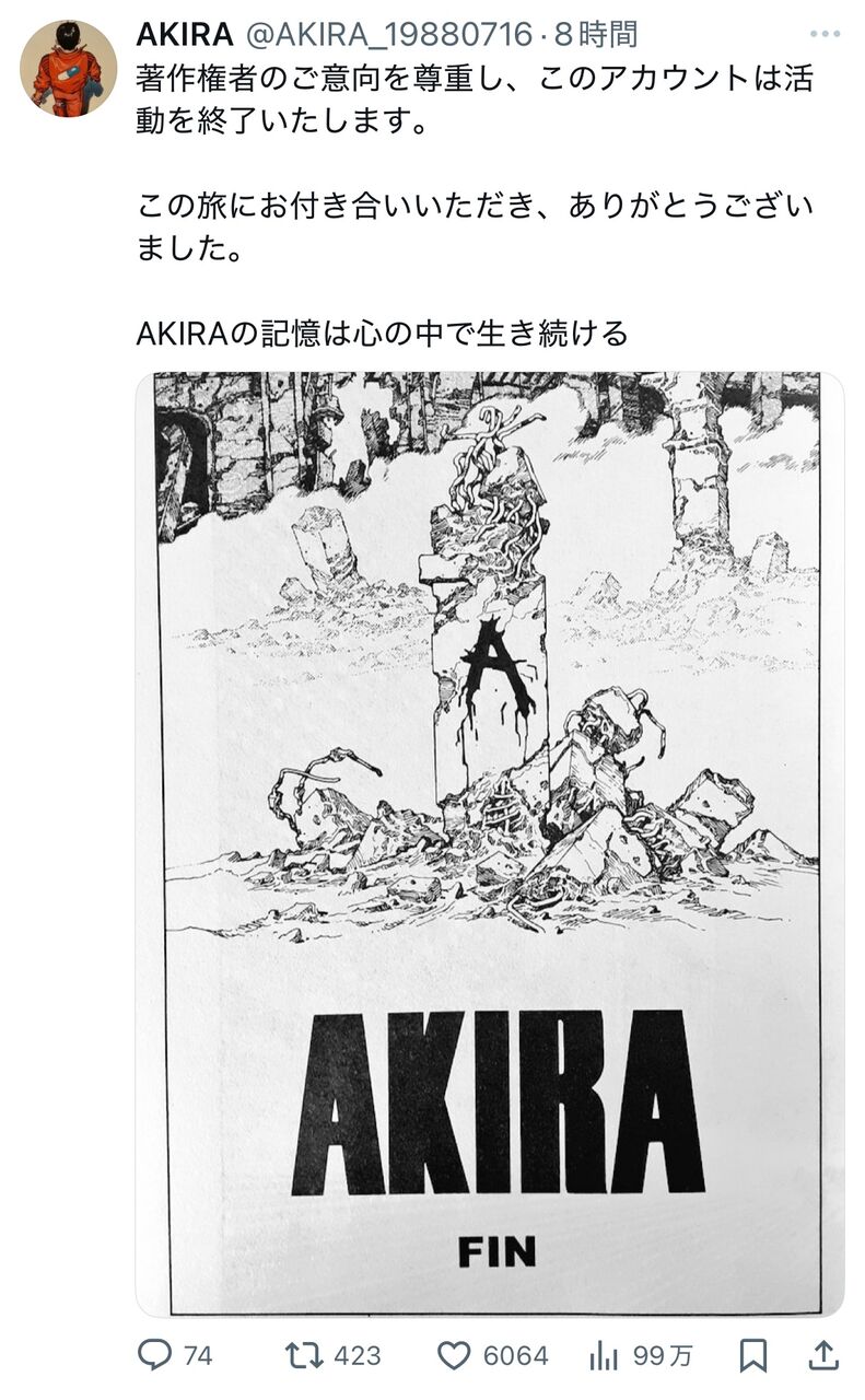 【悲報】公式っぽいAKIRAの無断転載アカウント、著作権者に怒られてカッコよく去る