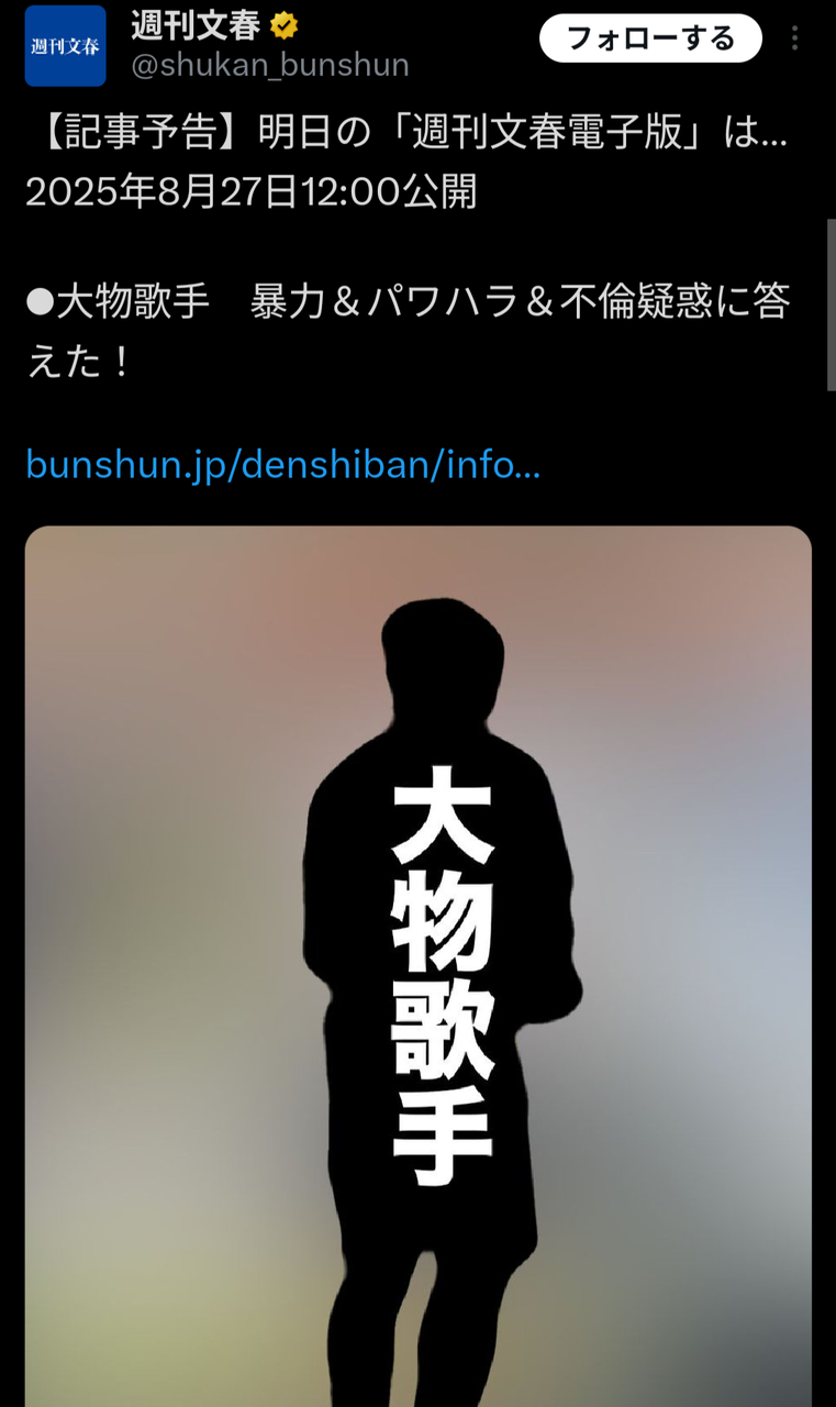 【文春】大物歌手、暴力&パワハラ&不倫疑惑