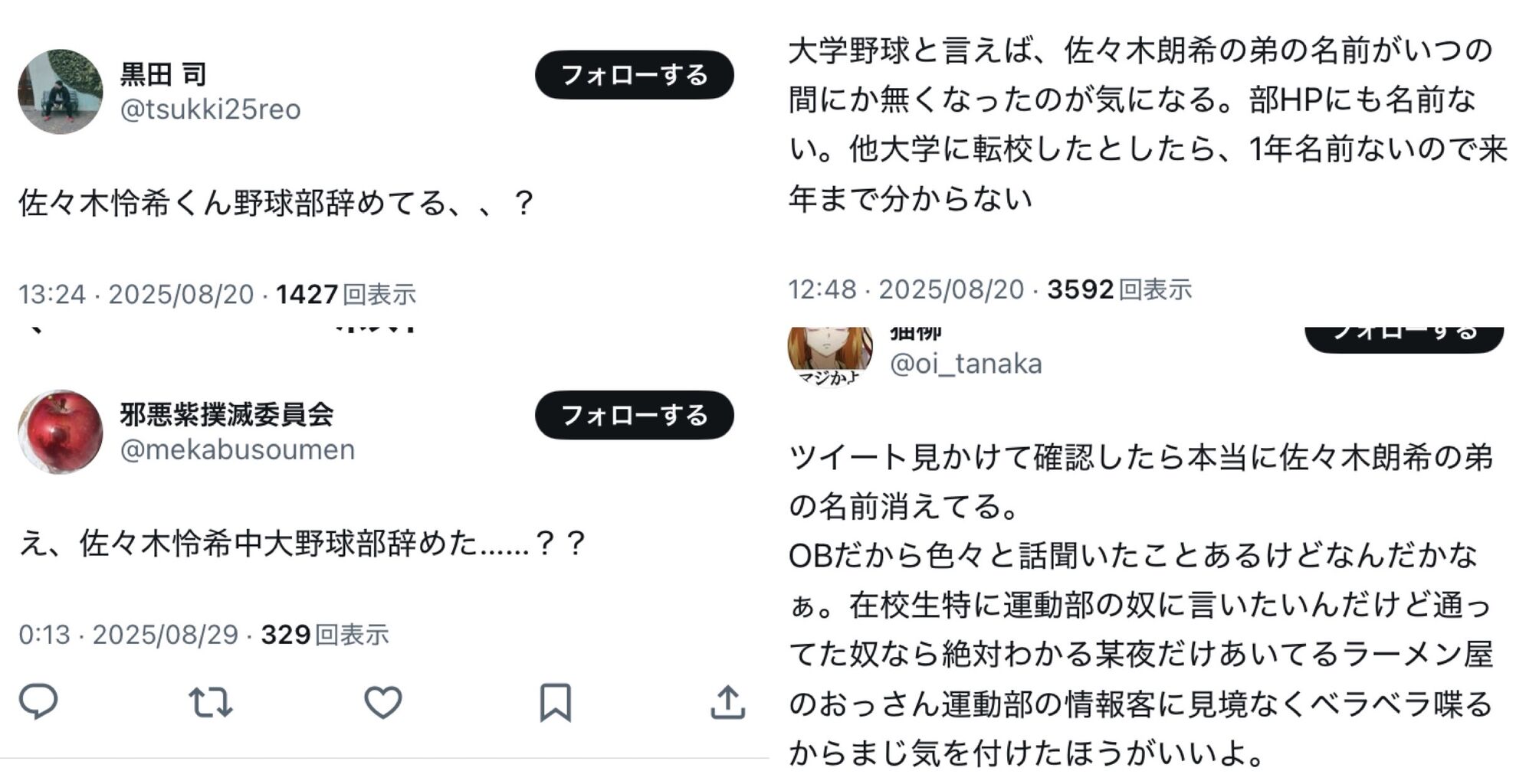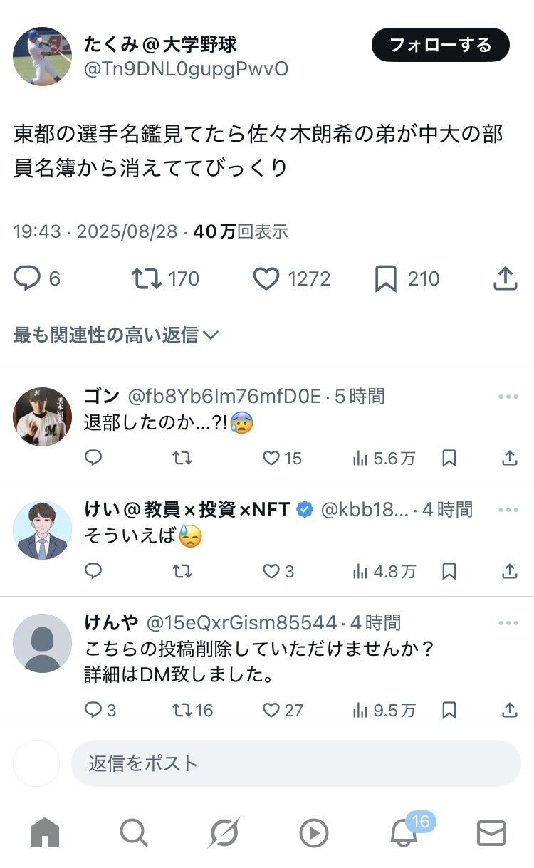 【超悲報】佐々木朗希の弟、東都大学リーグ・中大を退部か