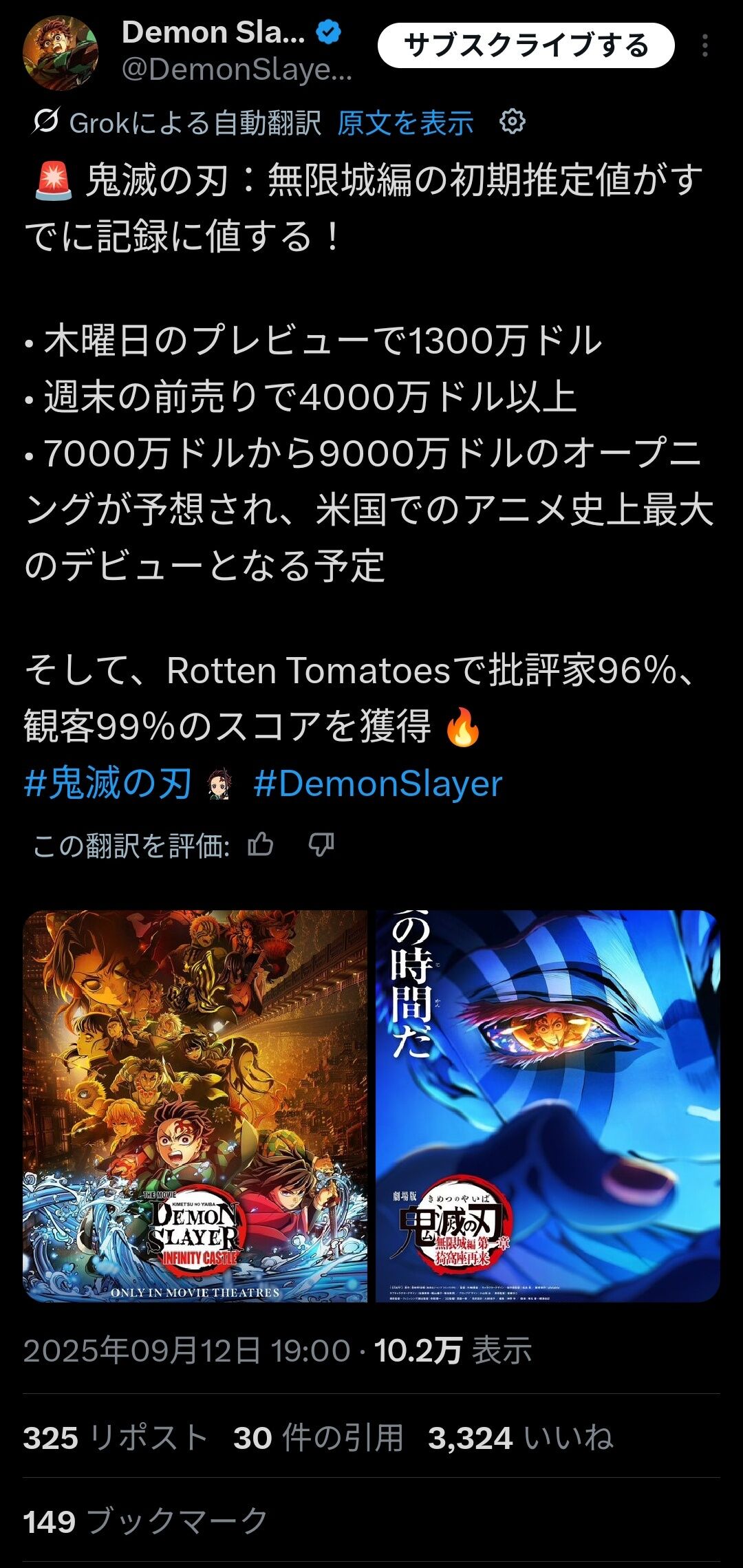 【速報】鬼滅の刃、アメリカで初週100億円超え確実のスタート!!!!!!!!!!