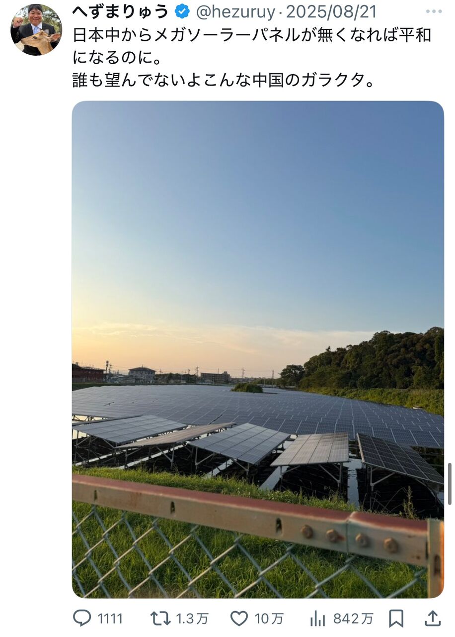 へずまりゅう「日本からメガソーラーパネルが無くなれば平和になる。中国製のガラクタなんか必要ない」