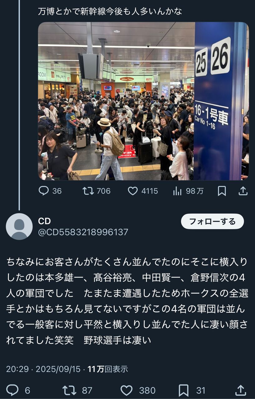 福岡ソフトバンクのコーチ陣、新幹線の改札の行列で横入りする