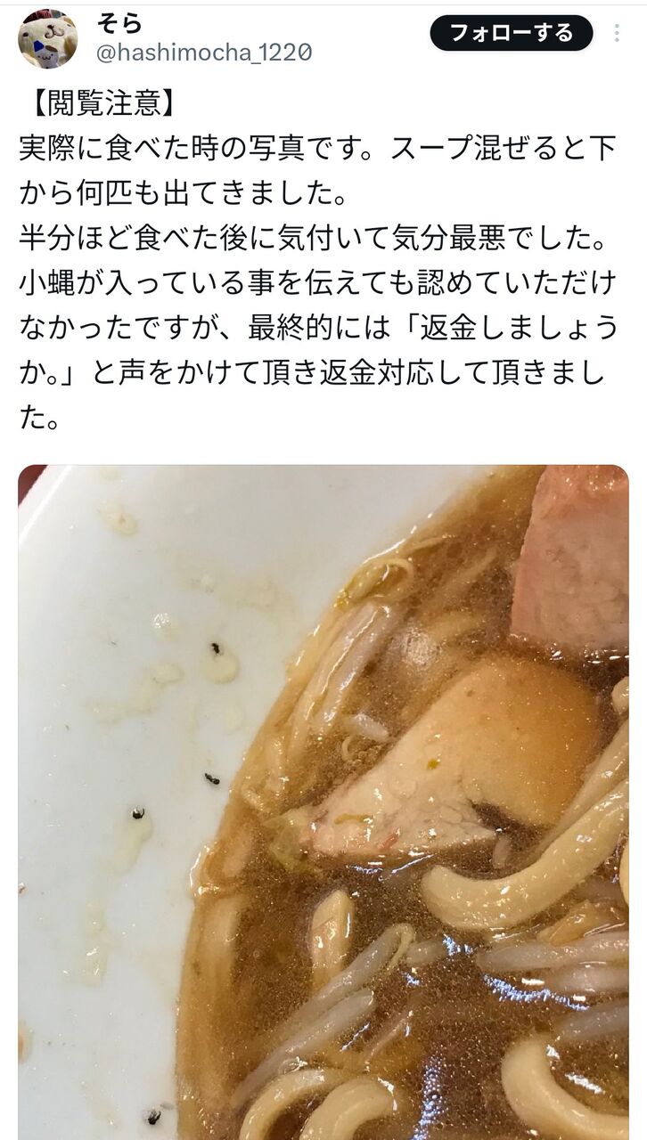 【悲報】二郎系ラーメン屋さん、態度が悪いだけでなくコバエラーメンを提供したことが発覚して爆発炎上