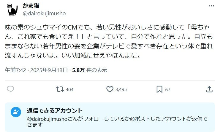 【悲報】味の素のシュウマイのCM、批判を受ける