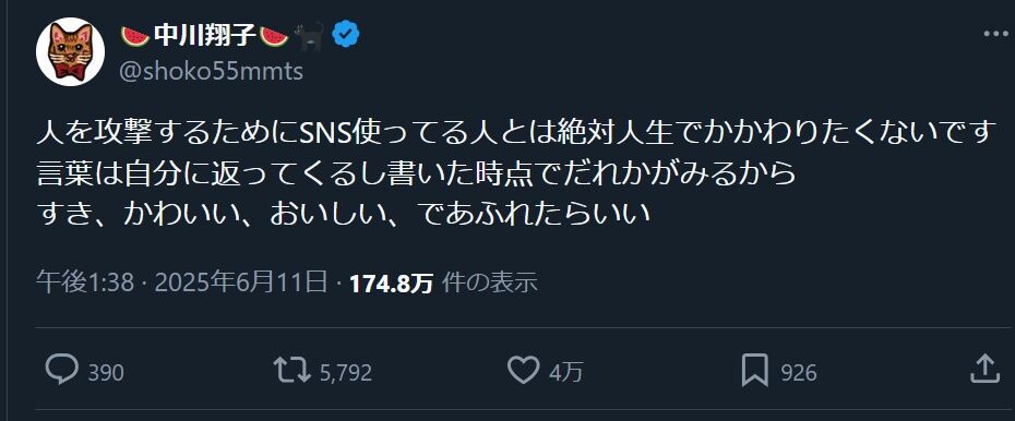 中川翔子「人を攻撃するためにSNS使ってる人とは絶対人生でかかわりたくないです」