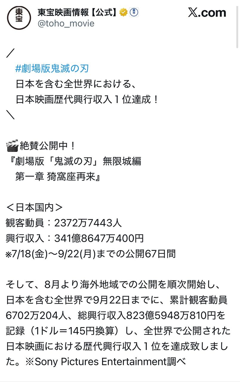 【朗報】鬼滅の刃無限城編、世界で公開された日本映画の歴史興行収入1位になる
