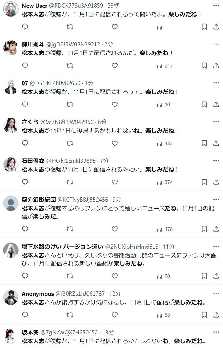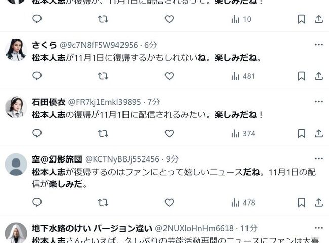 【悲報】松本人志さん復帰ニュースでXにとんでもない数の喜びの声が届き始める
