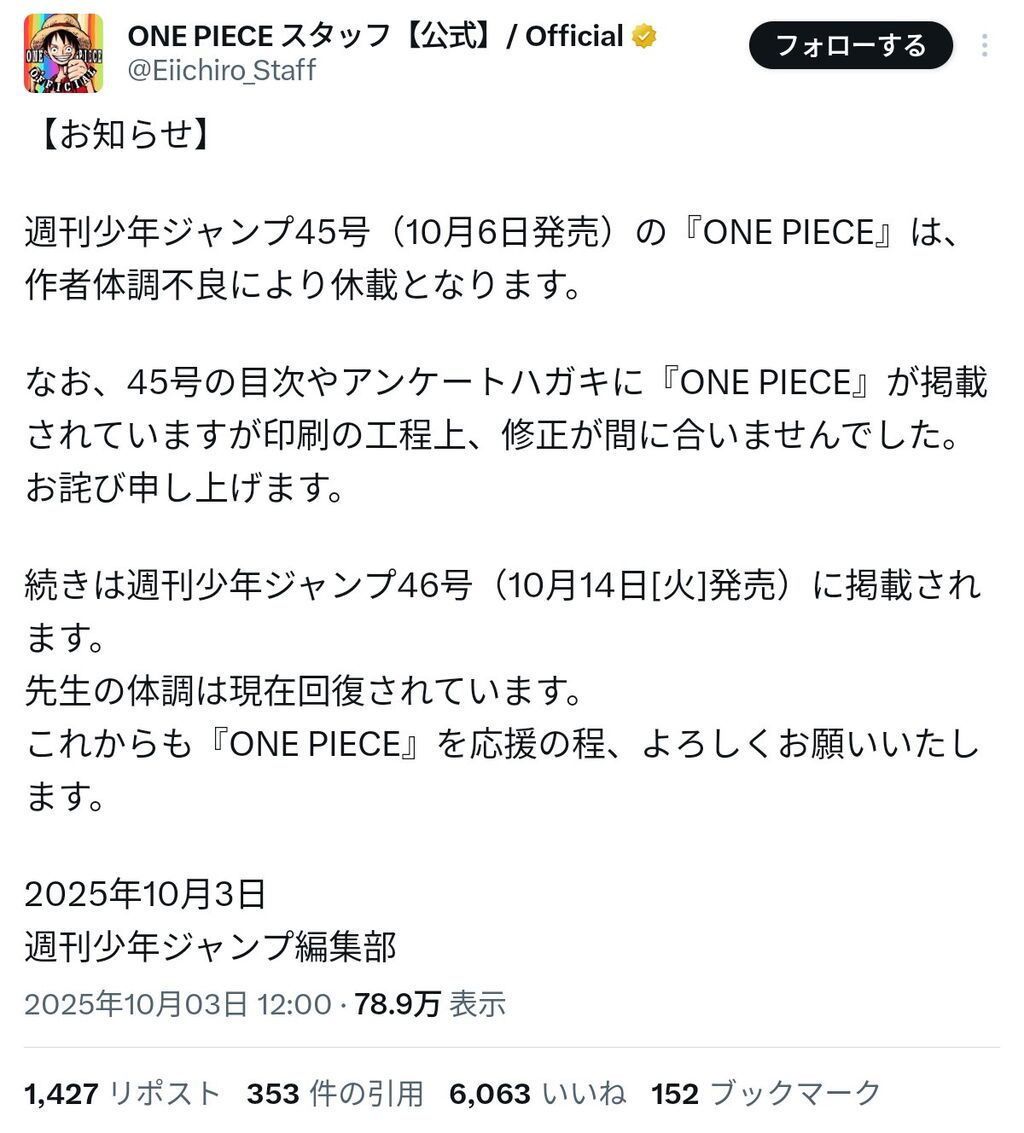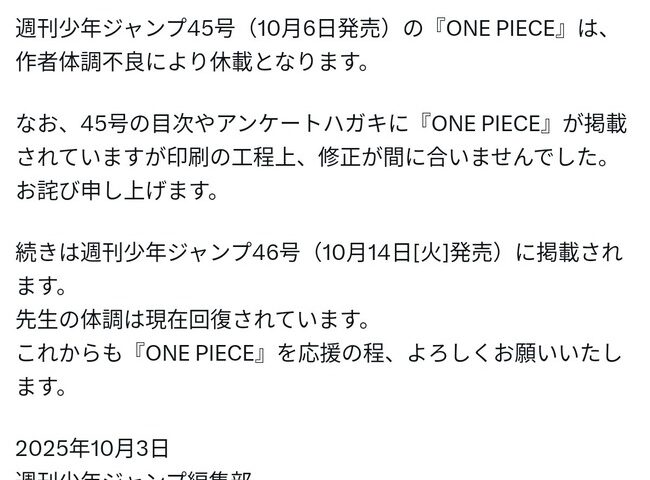 投稿では「【お知らせ】」とし「週刊少年ジャンプ45号(10月6日発売)の『ONE PIECE』は、作者体調不良により休載となります」と発表。