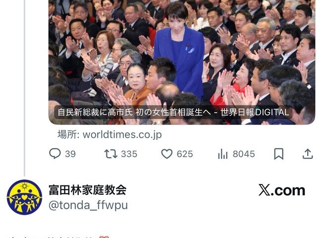 【画像】統一教会、高市総理に大喜びwwwwwww