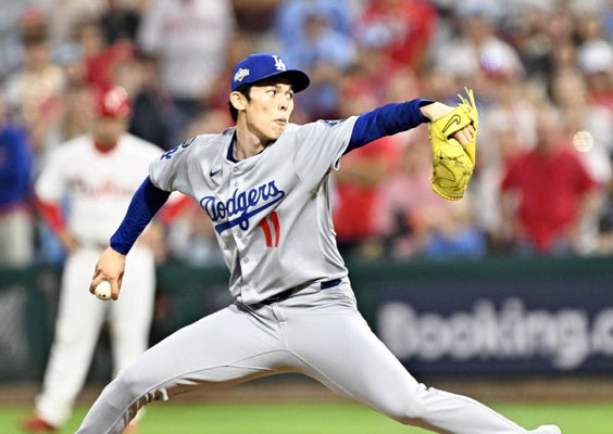 佐々木朗希投手は3点リードから1点差に迫られた九回2死一、三塁の大ピンチで登板。強打者ターナーを二ゴロに抑えて、ポストシーズン2セーブ目を上げた。
