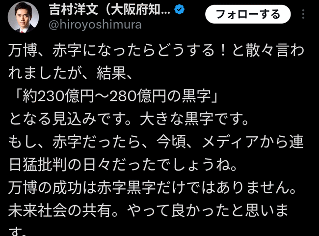 【速報】吉村知事勝利宣言「赤字だったらどうすると散々言われたが万博は230億~280億円の黒字」