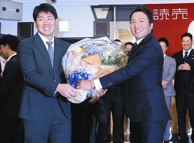 集まった全選手、スタッフと固い握手を交わし、お互いに感謝を伝え合うと、長野は受け取った花束とは別の大きな花束をスタッフから受け取り「和真!!」と主砲の岡本を招集。「え?」と動揺しつつもある岡本だったが、長野は〝サプライズ返し〟となる花束を贈呈。今オフでのメジャー挑戦も視野に入れている後輩に対し「いってらっしゃい!」と長野らしい演出でエールを送った。