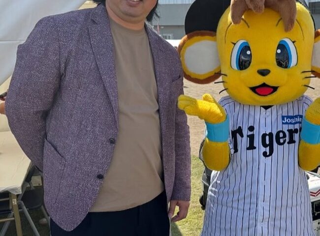 阪神マスコットのコラッキー、フリーアナウンサーの市川いずみさんと並んだ3ショットが