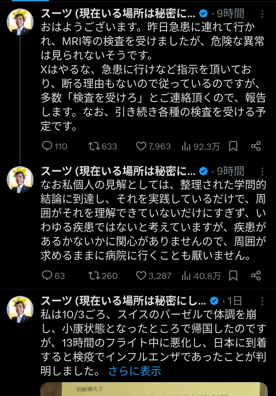 【朗報】スーツ交通「急患に連れて行かれMRI検査を受けたが異常なし。引き続き各種検査を受ける
