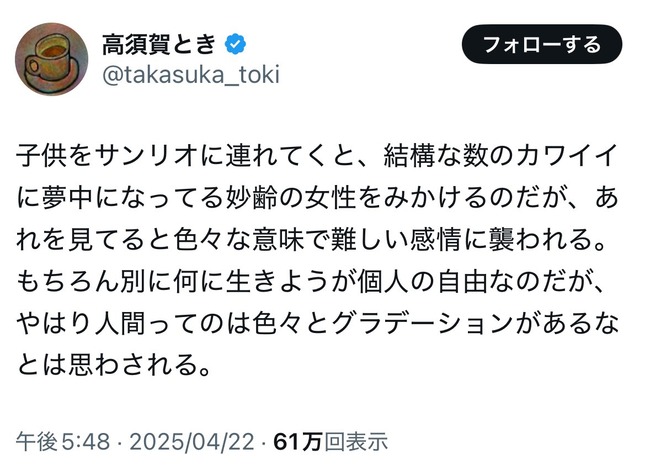 ツイッター「サンリオランドに子連れで行ったらいい年こいたBBAがいて気持ち悪かったです」