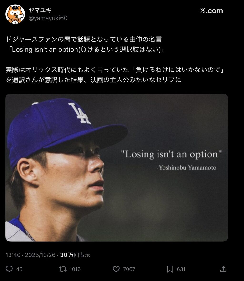 【悲報】山本由伸さん、通訳の意訳でビッグマウスにされてしまうwwwwwwwww