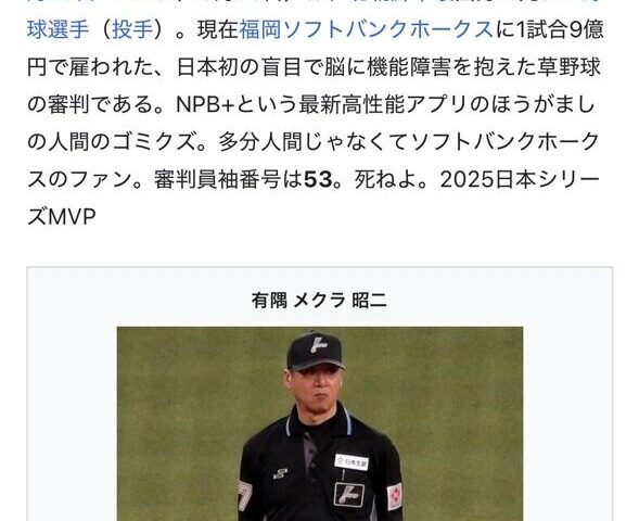 【悲報】阪神ファン、第2戦の主審のウィキベディアを荒らしてしまう