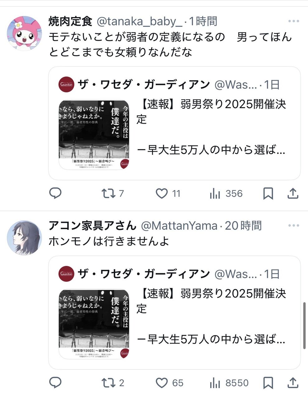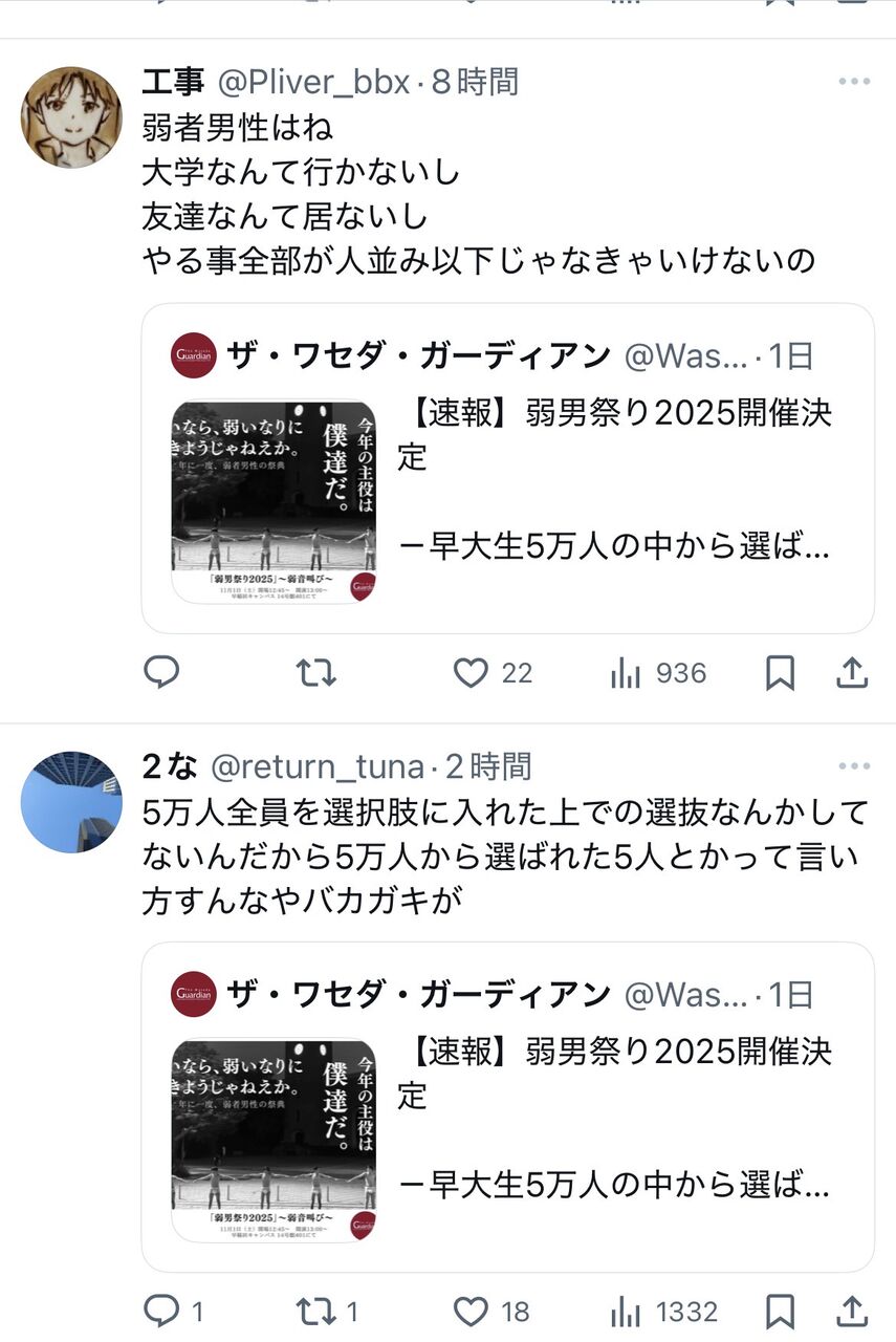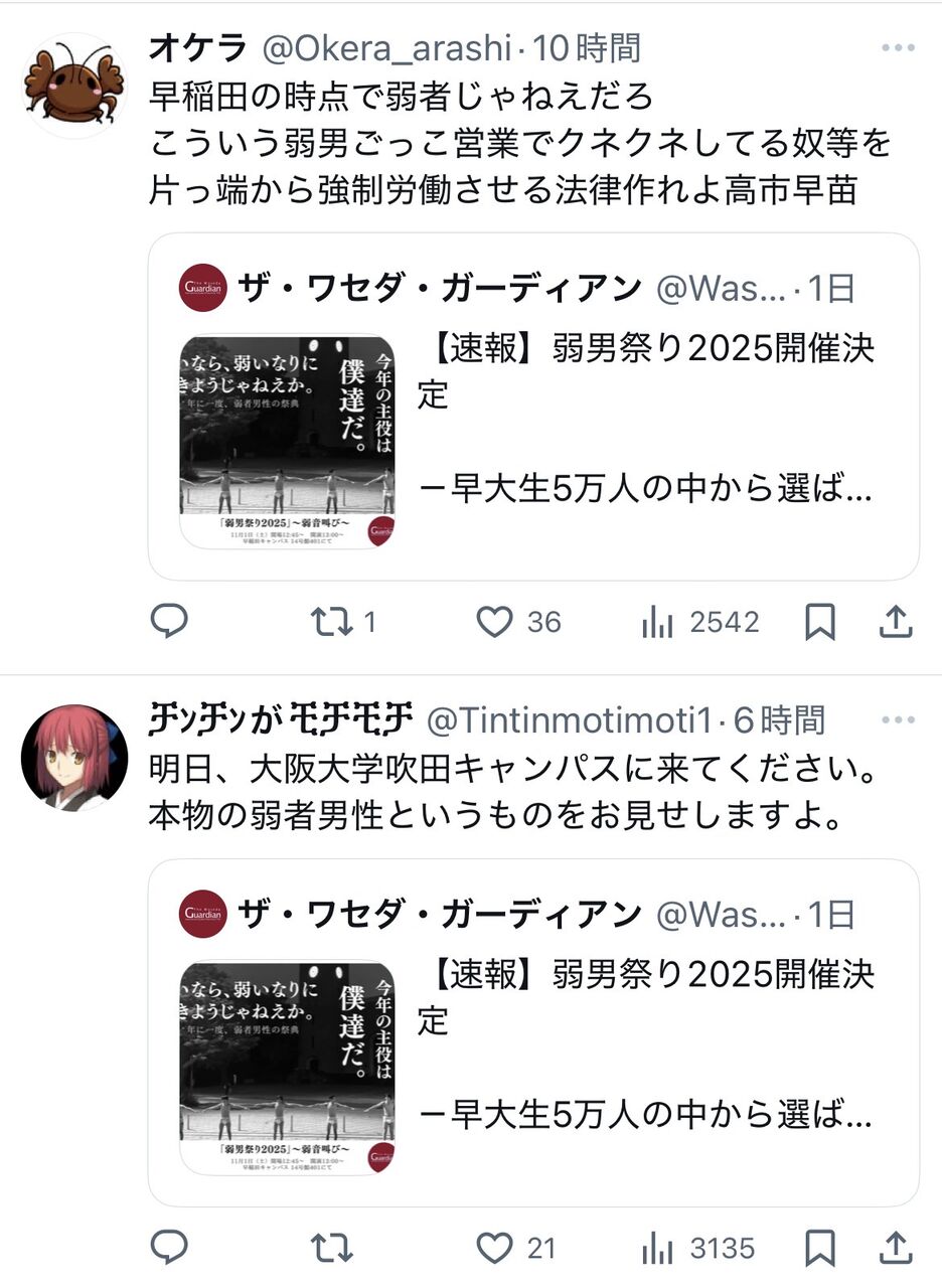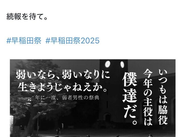 早稲田大学「弱男祭り開催!」本物の弱男「お前らは弱男じゃねぇだろ!偽物だ」→炎上