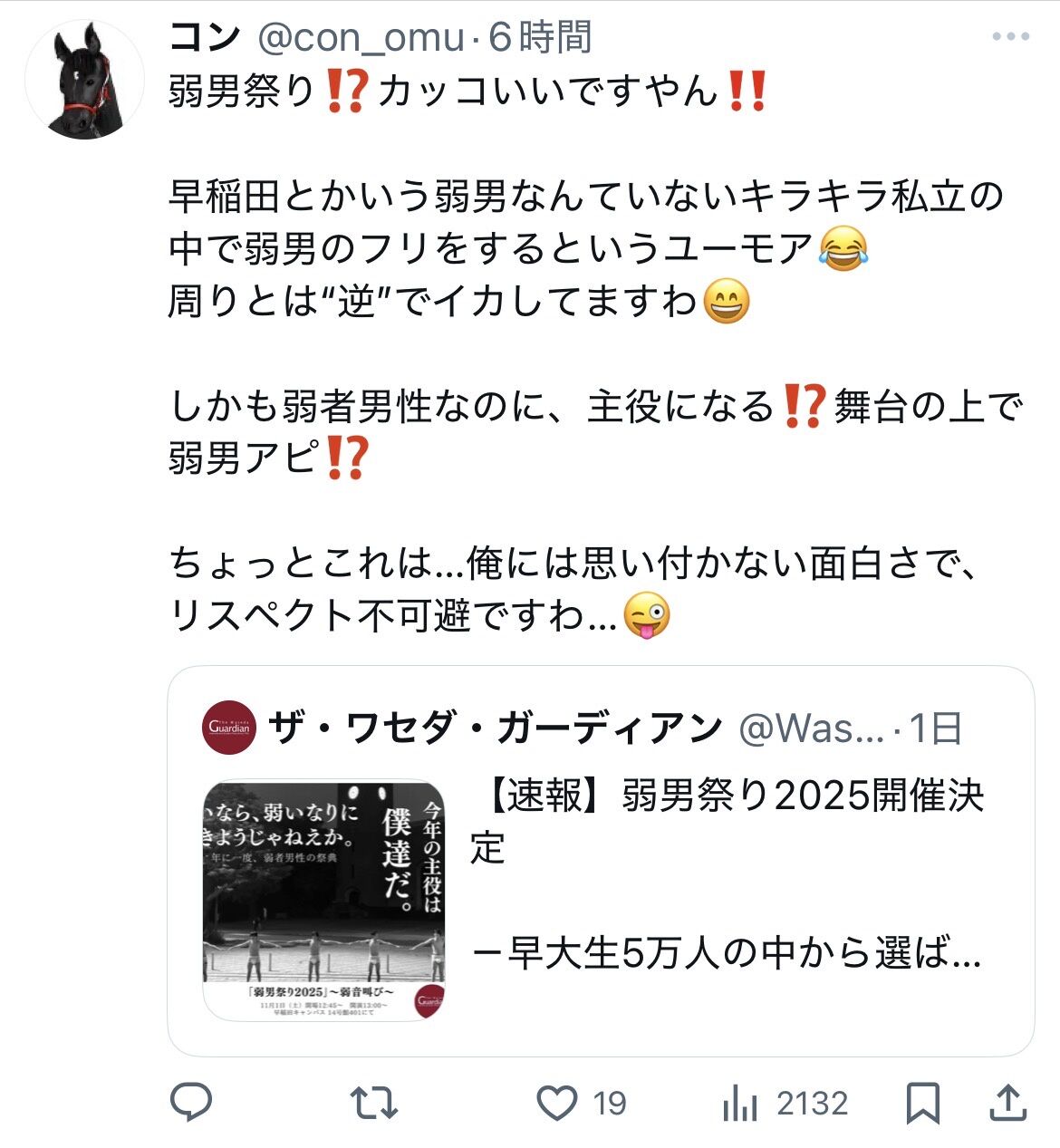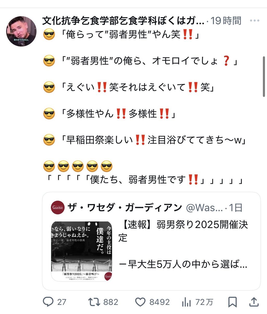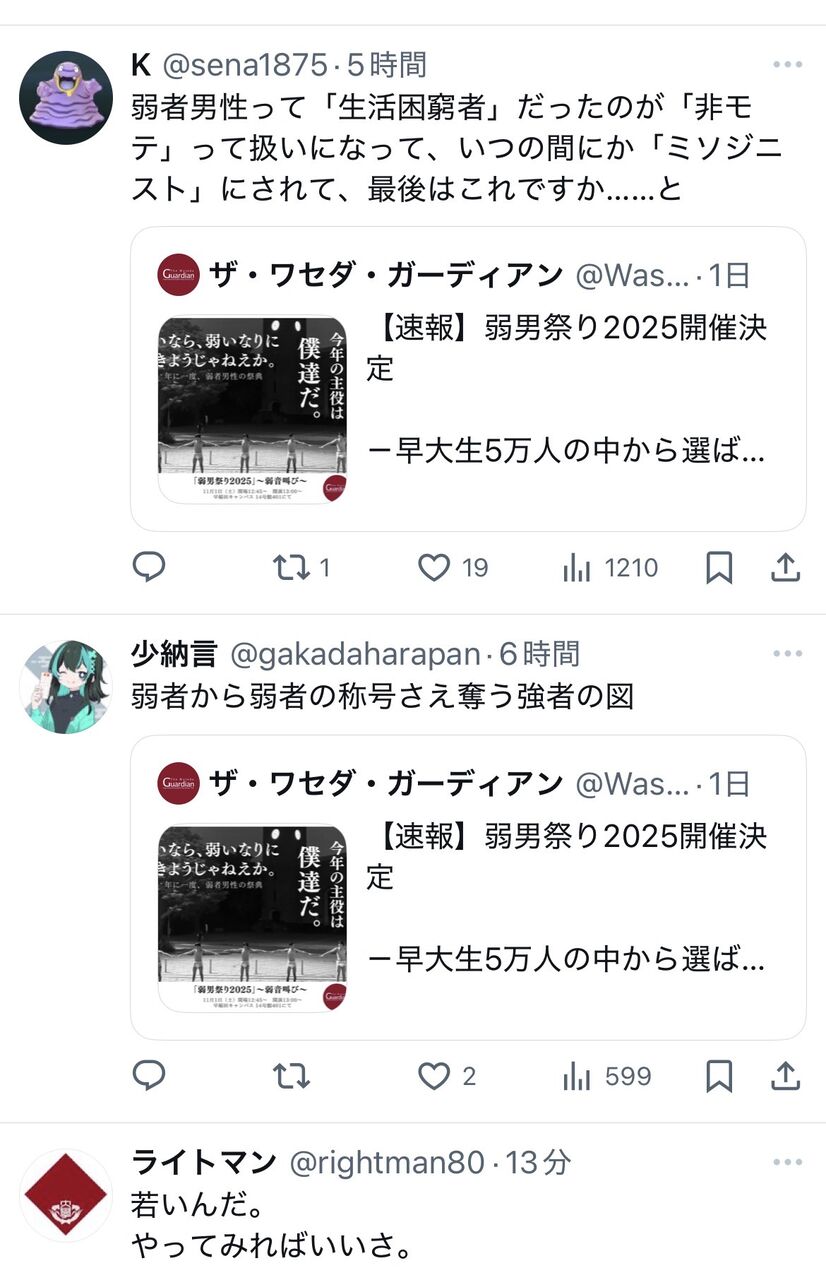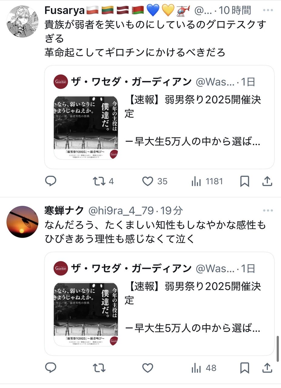 早稲田大学「弱男祭り開催!」本物の弱男「お前らは弱男じゃねぇだろ!偽物だ」→炎上