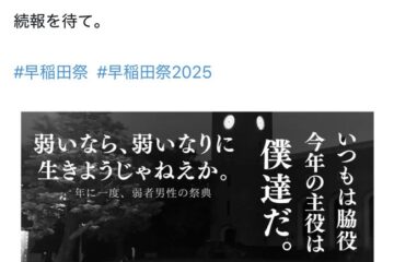 早稲田大学「弱男祭り開催!」本物の弱男「お前らは弱男じゃねぇだろ!偽物だ」→炎上