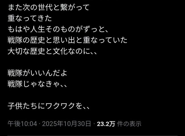 そして「戦隊じゃないと満たせないものがあるんだ 子供たちが憧れて思い出になって また次の世代と繋がって 重なってきた もはや人生そのものがずっと、戦隊の歴史と思い出と重なっていた 大切な歴史と文化なのに、、戦隊がいいんだよ 戦隊じゃなきゃ、、子供たちにワクワクを、、」と思いを吐露した。