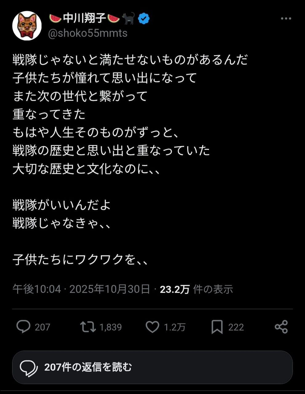 そして「戦隊じゃないと満たせないものがあるんだ 子供たちが憧れて思い出になって また次の世代と繋がって 重なってきた もはや人生そのものがずっと、戦隊の歴史と思い出と重なっていた 大切な歴史と文化なのに、、戦隊がいいんだよ 戦隊じゃなきゃ、、子供たちにワクワクを、、」と思いを吐露した。