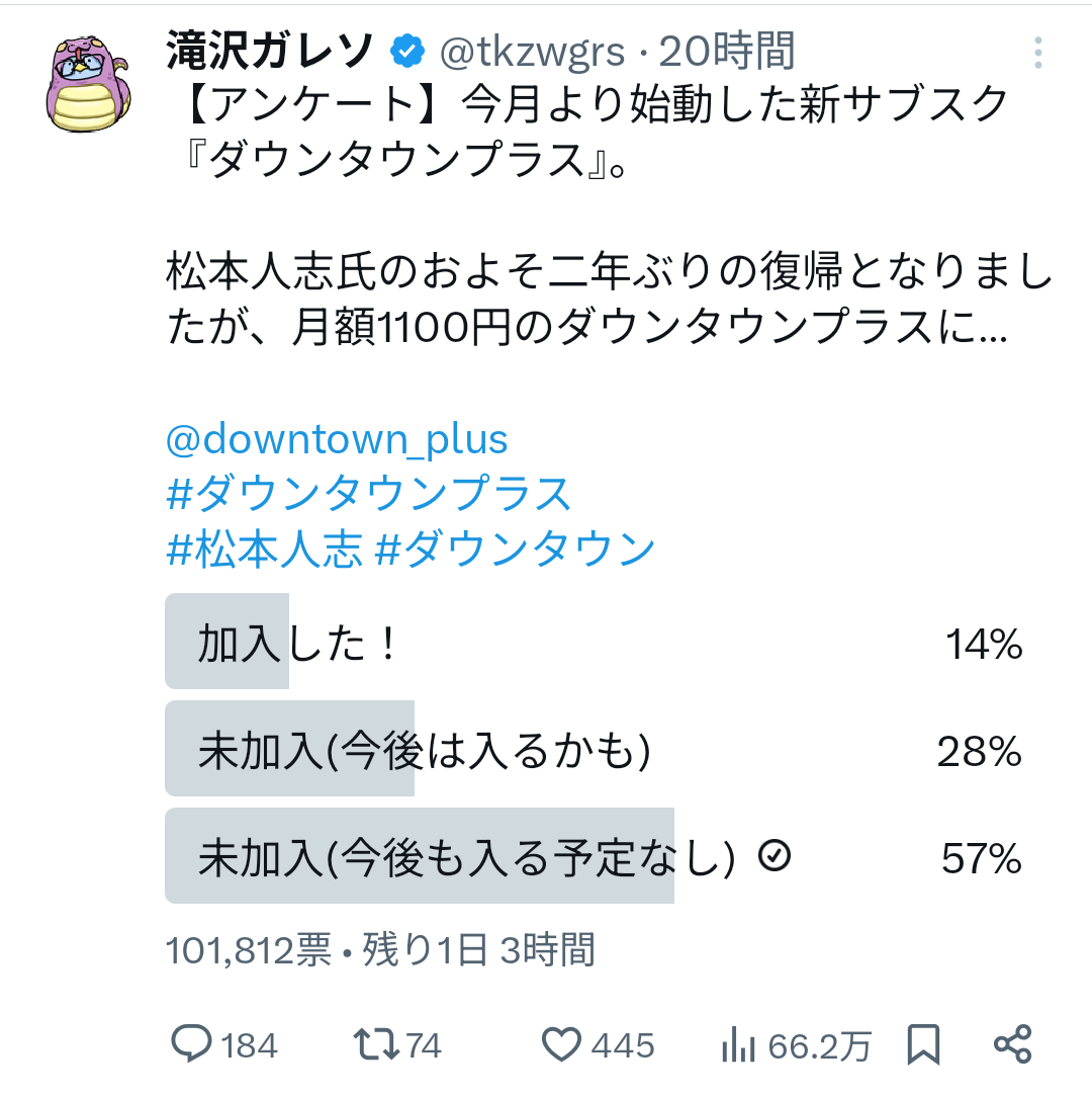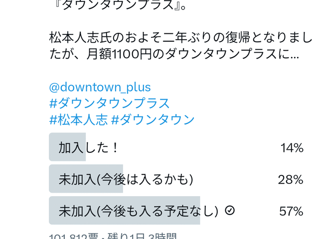 松本人志さん、インフルエンサーにダウンタウンプラスのアンケートをとられて悲惨な結果になる