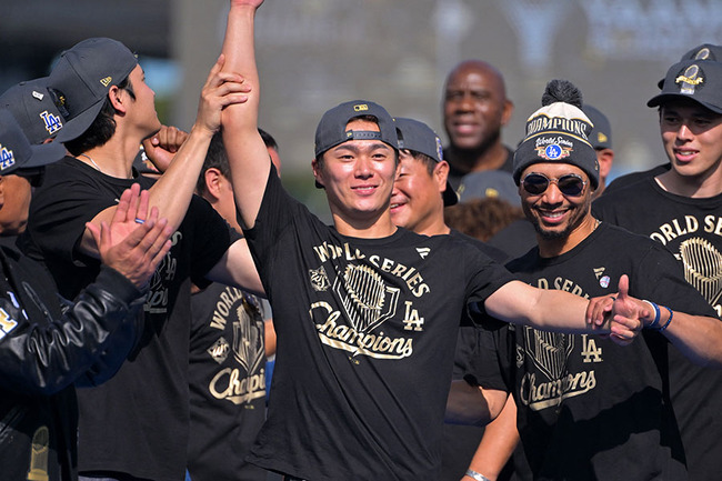 ワールドシリーズ(WS)2連覇を飾ったドジャースが3日(日本時間4日)、本拠地ロサンゼルスで優勝パレードを実施。その後にドジャースタジアムに移動し、優勝報告会を行った。