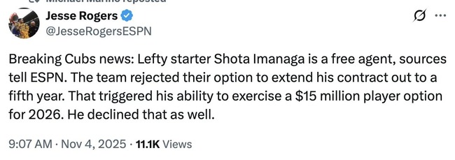 カブス速報:左腕先発投手の今永翔太がフリーエージェントになったと情報筋がESPNに語った。
