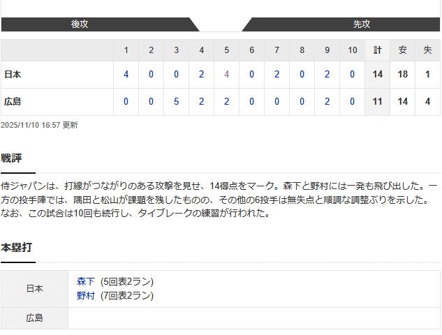 侍JAPAN猛打18安打14点!広島2軍に圧勝!