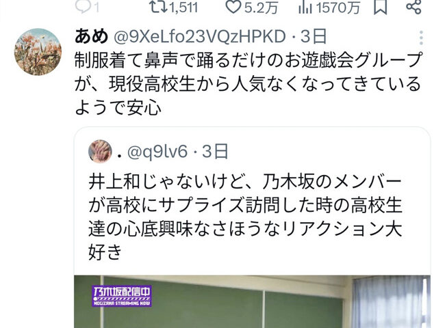 【悲報】乃木坂46批判にXで賛同の嵐「制服で踊るお遊戯会」「オジサン向けで若者は興味無い」