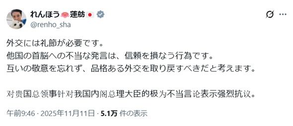 立憲民主党の蓮舫参院議員が11日、自身のX(旧ツイッター)を更新し、中国語での抗議文を掲載した。