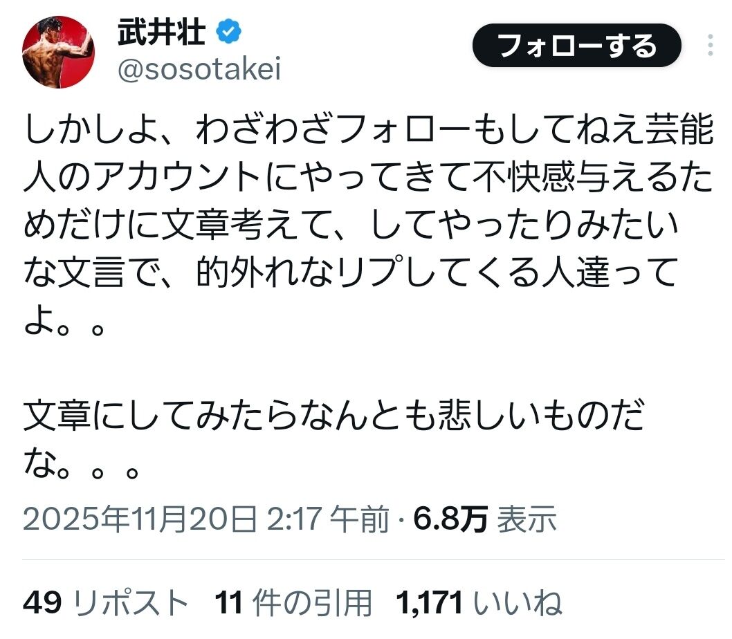 【画像】武井壮、アンチにマジ切れwwwwwwwwww