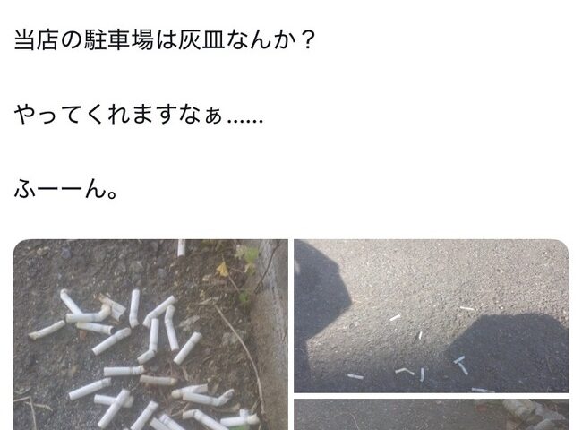 【画像】二郎系ラーメン屋さん、吸殻捨てられブチ切れ