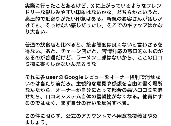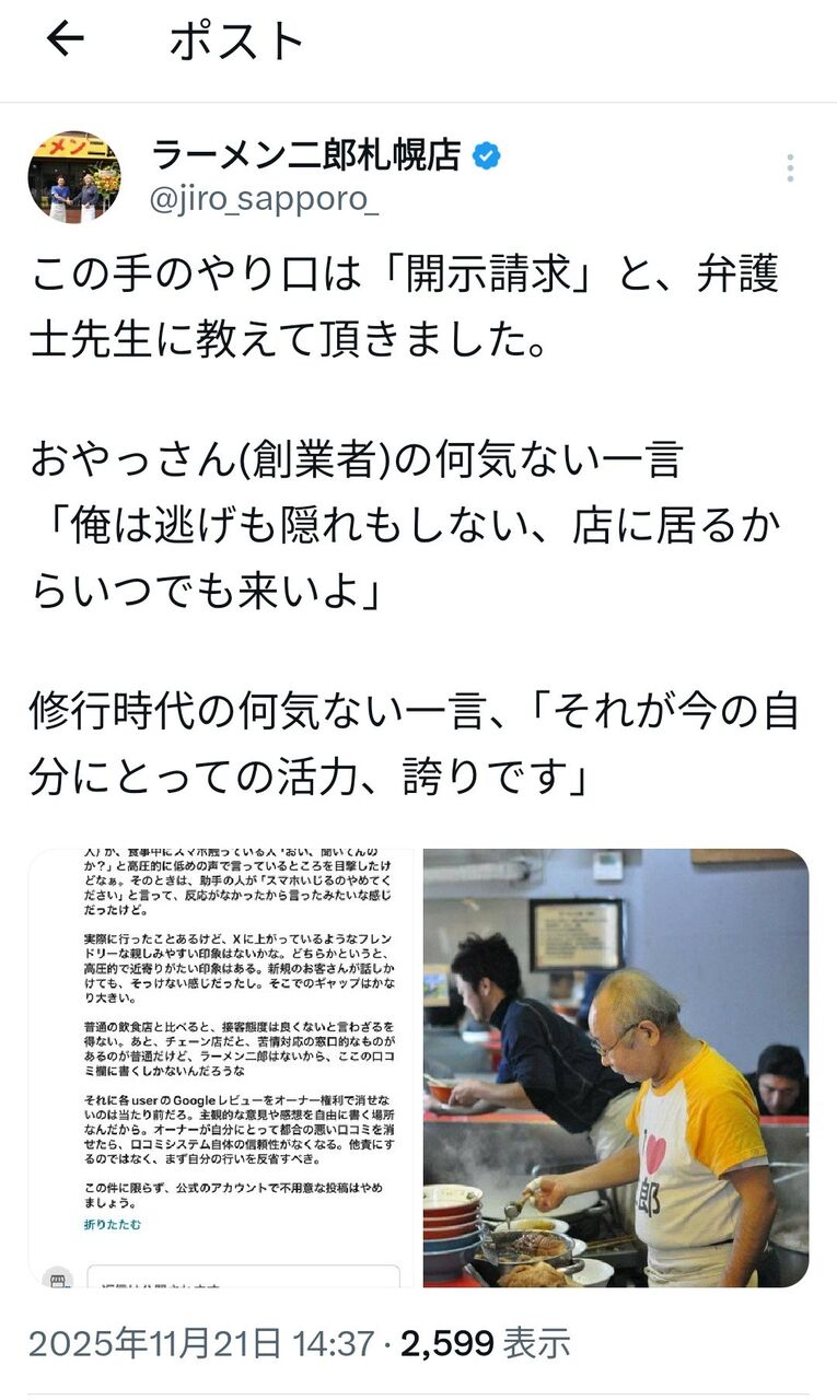 【悲報】ラーメン二郎札幌店、ただの口コミ批評に開示請求をちらつかせる