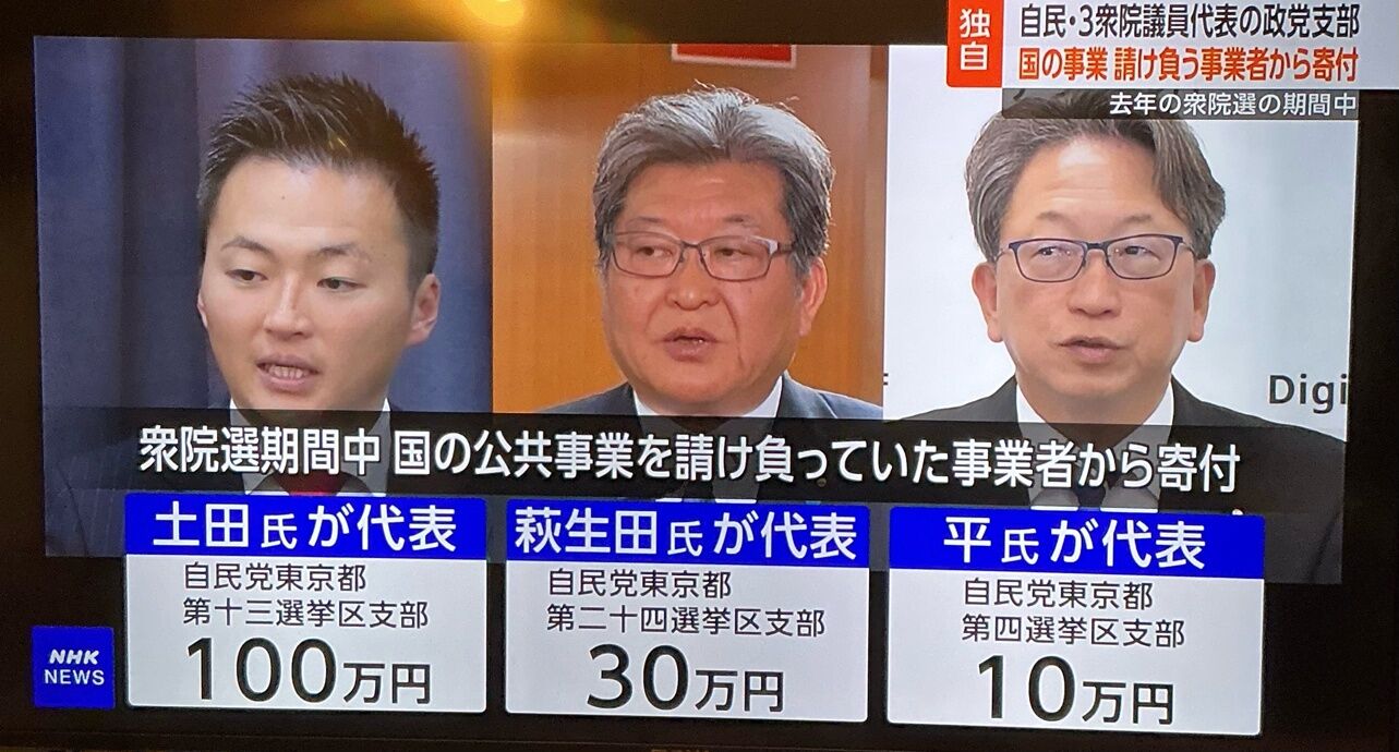 東京都が先週公表した政治資金収支報告書をNHKが調べたところ、いずれも自民党の土田前財務政務官と、萩生田幹事長代行、それに平前デジタル大臣が、それぞれ代表を務める政党支部が、国の公共事業を請け負っている事業者から、去年の衆議院選挙の期間中に寄付を受けていたことがわかりました。NHKの取材に対し、3人の事務所はいずれも寄付をすでに返金したか、今後、返金する予定だとしています。