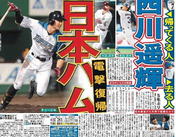 【悲報】西川遥輝さん(33)、5年ぶりの古巣日ハム復帰wwwwwwwwwww