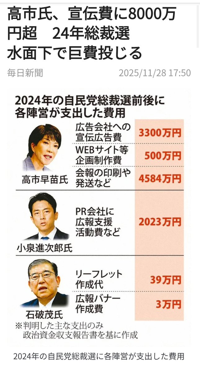 高市氏、宣伝費に8000万円超 24年総裁選 水面下で巨費投じる