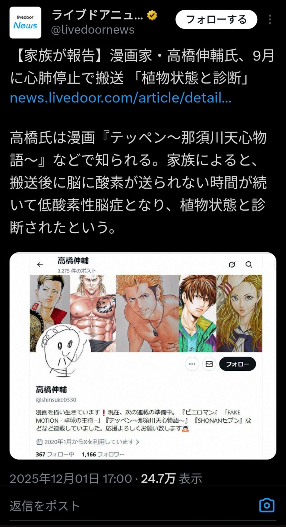 【悲報】人気漫画家・高橋伸輔さん(44)、搬送され植物状態